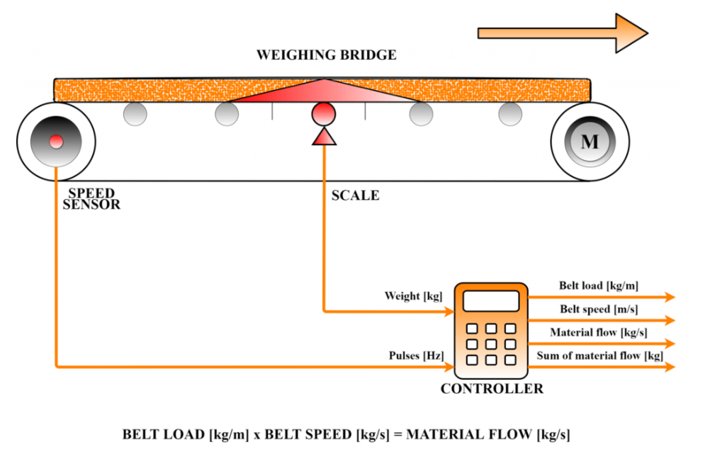 Eine typische Bandwaage besteht aus einer Messbrücke, die auf Dehnungsmessstreifen-Sensoren angebracht ist, einem elektronischen Messgerät und einem Bandgeschwindigkeitssensor. Die Dehnungsmessstreifen-Sensoren bestimmen das Gewicht des Materials auf dem Band. Diese Information wird in Form eines Spannungssignals vom elektronischen Messgerät interpretiert. Zusammen mit dem Gewicht liest das Gerät auch die Geschwindigkeit in Form von Impulsen vom Bandgeschwindigkeitssensor ab. Auf der Grundlage dieser beiden Messwerte werden der Massenstrom auf dem Band [kg/s, t/h] und der Zählerstand [kg, t] berechnet.